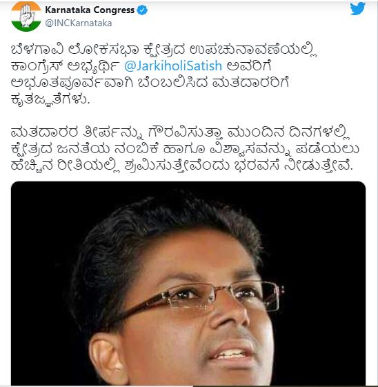 ಕುಂದಾನಗರಿ ಬೆಳಗಾವಿ ಚುನಾವಣಾ ಫಲಿತಾಂಶ ಇಡೀ ರಾಜ್ಯದ ಜನರನ್ನು ತುದಿಗಾಲಿನಲ್ಲಿ ನಿಲ್ಲುವಂತೆ ಮಾಡಿದ್ದಂತೂ ನಿಜ. ಕೊನೆಗೆ ಮಂಗಳಾ ಅಂಗಡಿ ಮೊಗದಲ್ಲಿ ನಗು ಅರಳಿದರೆ, ಕೊನೆ ವರೆಗೆ ಹೋರಾಡಿ ವೀರೋಚಿತ ಸೋಲು ಕಂಡ ಕಾಂಗ್ರೆಸ್ನ ಸತೀಶ್ ಜಾರಕಿಹೊಳಿ ವಿಷಾದದ ಜೊತೆಗೆ ಭರ್ಜರಿ ಸ್ಪರ್ಧೆ ನೀಡಿದ ನೆಮ್ಮದಿ ಇದೆ.